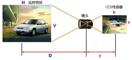 其中,f代表焦距,v代表CCD靶面垂直高度,V代表被观测物体高度,h代表CCD靶面水平宽度,H代表被观测物体宽度。